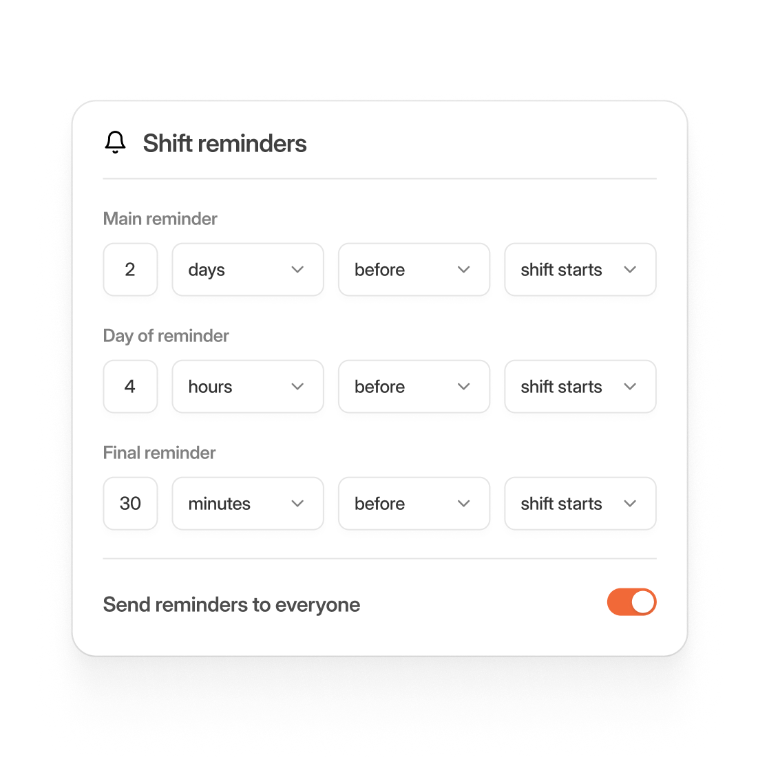 No need to trigger reminders once you schedule them minutes, hours or days before a shift.